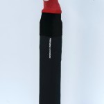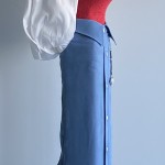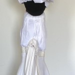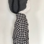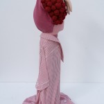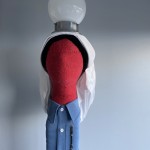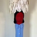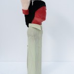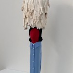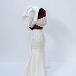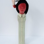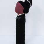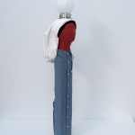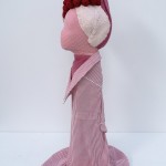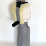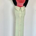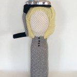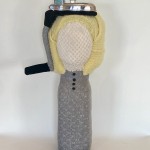 I chose to focus my work on a more contemporary 1970s laundress whilst referencing the past. Her clothing is two tone with a soft grey woollen base with velvet buttons and a black velvet wringer handle which extends over the top of her head as if resting on an iron stand. The white towelling face represents the bleaching and starching along with an incredible range of other treatments in the effort to erase all stains. Her flesh and the metal of the iron and handle act as one whole incapsulating the person, the act and the mechanism as one function.