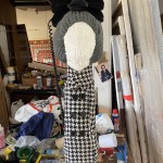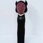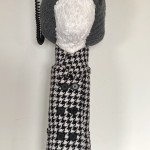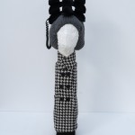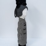 1970’s Receptionist has three black velvet covered phones concertinaed on her head noting the relentless volume of calls that would come in. As receptionist were not required to wear a uniform, I dressed her in classic woollen black and white houndstooth to complement the black phones, the cord of the phone attached to her ear.