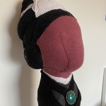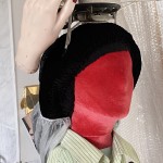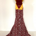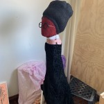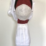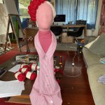 I chose Mary Mollie Carr for her commitment as a young woman and as a figurehead to remember all Australian nurses who should be recognised for their service around the time of WW1. Almost 100 years on since the Spanish Flu, Covid19 arrived in Australia which make Mollie’s story even more poignant and relevant. She is dressed in white. I used a stretched nylon material to sew together her flowing dress; white cotton shirts for her blouse and nurse’s cap. A lace mask representing the butter cloth masks used at the time covers a deep maroon chenille face.
