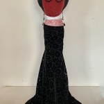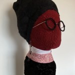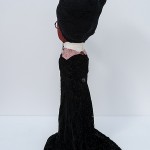 As reference to make my sculpture I used the 1940 obituary head and shoulders photograph from the Newcastle Morning Herald and Miners’ Advocate newspaper. From that and earlier photographs she appeared as a slightly eccentric woman with a kind but determined demeanour. I’ve created her with materials of the day, dressed in a long flowing black lace gown with an art nouveau patterned pink neck with white collar and a deep maroon chenille face and given her a mass of dark hair bunched on her head and horn-rimmed glasses and long dangling black earrings.