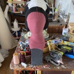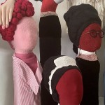The wooden bases and latex and foam heads are under-wrapped in malleable layers with a soft underfelt of various stretchy materials to build up the heads to a fuller form, then completed with outer layers of carefully selected fabrics cut and stitched over the underfelt. All heads are featureless and void of expression, stylised to represent the many workers of diverse backgrounds who have passed through the hospital over the decades. I have avoided using obvious flesh tones in the faces, instead blending different tactile textures and various shades of deep reds, soft pinks and maroons. Perhaps I chose these colours to represent blood or life.