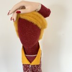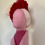 ‘Yellow Psych Volunteer’ is dressed in her yellow shirt with a maroon floral smock to match her face and neck. Mustard yellow mohair wool for hair with a plaster hand with nail polish like a hat on top of her head – again to denote volunteer service and a helping hand.