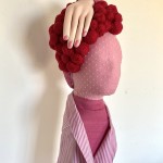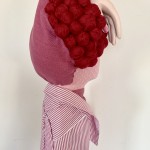 I received a Pink Ladies smock and a Yellow Psych smock in the mail. Both these items of clothing are bright – the Pink Ladies with white and pink candy stick lines and the Psych Volunteers smock a sunny bright yellow, approachable and friendly. I dressed my Pink Lady in various shades of pink. A soft cotton face with white spots, maroon woollen balls as hair with a plaster hand with pink nail polish like a fascinator on top of her head – a symbol of giving, helping and supporting.