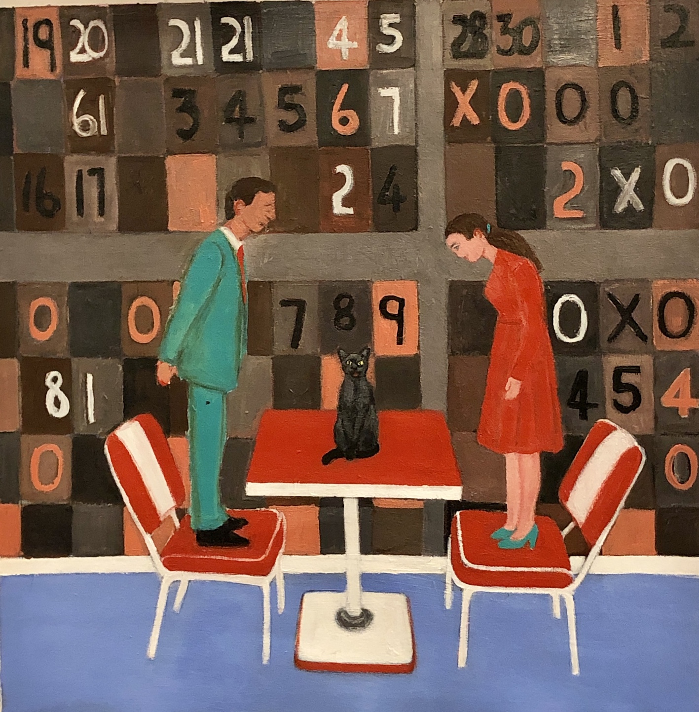 ‘The Cat’ – acrylic on canvas. 61 x 61cm Numbers, dates, time, infinity, always in a state of flux. Are these people together? Do they exist? Is the cat real? Exhibition runs 1st December 2023-25th January 2024 Korean Cultural Centre Australia Gallery 255 Elizabeth Street Sydney