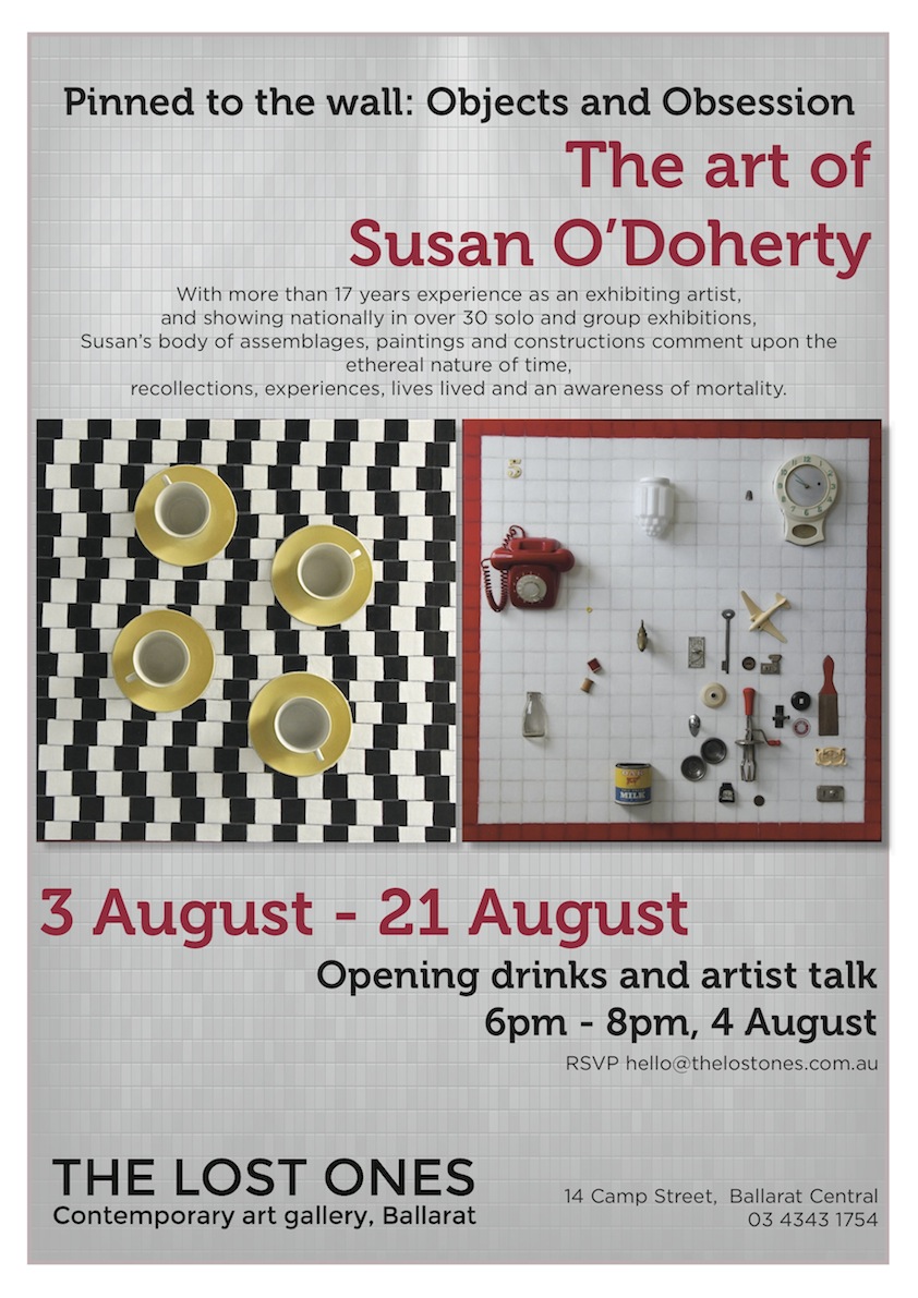Pinned to the Wall: Objects and Obsession Opens 4th August 2016 6pm-8pm The Lost Ones Gallery, 14 Camp St, Ballarat. This exhibition explores tensions in the domestic sphere, violence in the home and social inequality.